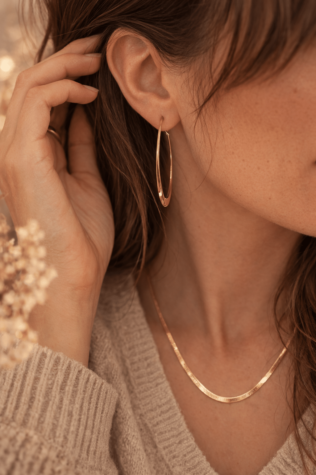 J’aime particulièrement porter les créoles Alma avec les cheveux attachés : chignon flou, queue de cheval ou cheveux relevés derrière l’oreille.